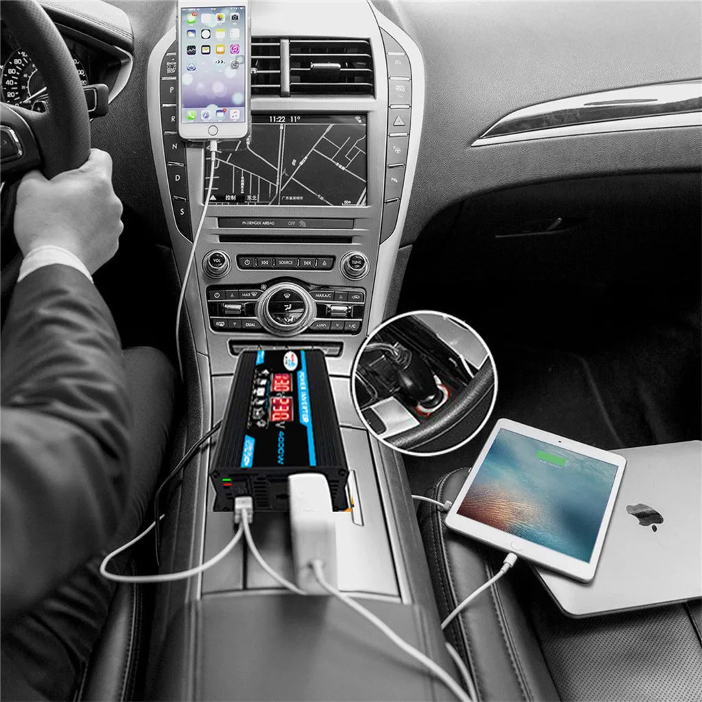 Converts 12V DC to 220V/110V AC with 4000W peak output